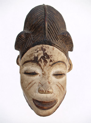 Masque Punu, Gabon. Hauteur: 30 cm. Ne portant pas de trous de fixation, ce masque, sculpté dans la masse, était probablement destiné à une case ou à un autel.