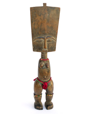 | Poupée de fécondité. Style Fanti, Ghana. Hauteur: 44 cm. Les poupées de fécondité étaient portées par les femmes enceintes, qui devaient éviter de poser les yeux sur des objets ou des êtres difformes, afin d'éviter que leurs enfants à venir ne leur ressemblent. Ces poupées, quant à elles, étaient censées favoriser la beauté de leur progéniture. |