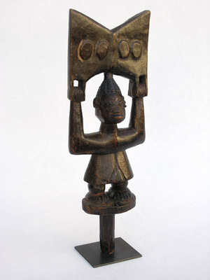 | Les Oshe des Yoruba servaient lors des danses rituelles. Généralement portés à la main gauche, ils représentent, au travers de la double hache, le dieu du tonnerre et de la jeunesse, Sango. Hauteur: 44,5 cm. Peuple Yoruba, Nigéria. |