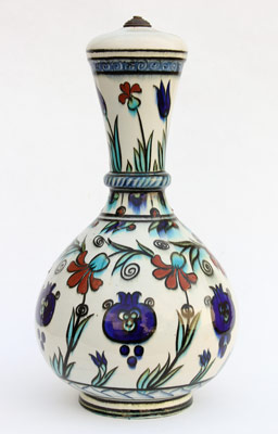 | Grande cruche à décor Iznik d'Edmond Lachenal (1855-1930), conçue à l'origine comme pied de lampe, de 61 cm de hauteur. Fin du 19e siècle. Signée "LACHENAL" et "JG" à la base. Formé par Théodore Deck, Edmond Lachenal fut à son tour le professeur de plusieurs céramistes de renom, dont Henri Simmen (1880-1963) ou Emile Decoeur (1876-1953), et collabora également avec des sculpteurs comme Rodin. |