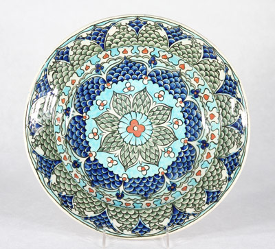 | Plat en faïence à décor Iznik d'Edmond Lachenal (1855-1930). Diamètre : 34,5 cm. Fin du 19e siècle. Signé "LACHENAL" au dos. C'est l'adaptation assez fidèle de l'un des motifs de la céramique d'Iznik du 16e siècle, connu sous le nom de "plat aux écailles de poisson", et que l'on retrouve dans les collections de Sèvres, d'Ecouen ou du Louvre. |