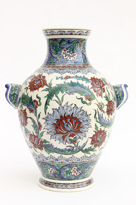 | Vase à décor Iznik de la Manufacture Samson. Paris, fin du 19e siècle. Hauteur: 33 cm. Signé à la base d'un monogramme "arabisant", typique de la production de la maison Samson, et qui entraîna bien des confusions, volontaires ou non, chez les antiquaires et les acheteurs potentiels. Cet exemplaire, par exemple, porte à la base les restes d'une ancienne étiquette où figurent les mots "céramique de Perse". |