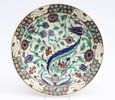 | Grand plat en céramique à décor Iznik, de 37 cm de diamètre. Années 1880. Porte au dos l'inscription B.F.K. et les lettres 22/54, qui correspondent au numéro de la forme et à l'artiste responsable du décor. La Louvière (Belgique). Le style "Rhodes" (nom donné à l'époque aux céramiques d'Iznik en Europe)est attesté chez Boch Frères Kéramis dès leur participation à l'exposition universelle d'Amsterdam en 1883. Le catalogue Boch de 1887 contient un très grand nombre de pièces à décor Iznik, où se cotoient tulipes, jacinthes, oeillets, feuilles de Saz disposées en rinceaux. |