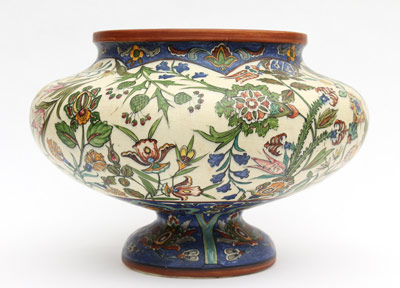 | Grand pot en faïence à glaçure mate de Jerôme Massier Fils (1850-1916). Décor signé de J. Pardi. Signé à la base Jerome Massier Fils - Vallauris - A.M. France. Diamètre: 40 cm. Années 1880. Les adaptations de décors iznik sur du Vallauris sont assez rares. La dynastie Massier vit le jour au tout début du 18e siècle. Néanmoins, ce sont surtout les fils de Jacques Massier (1806 -1871), Delphin (1836 - 1907), Clément (1844 - 1917) et leur cousin Jean-Baptiste, alias Jérôme fils (1850 - 1916), qui contribuèrent à faire de Vallauris une référence mondiale en matière de poterie d'art. |