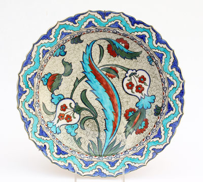 | Plat en faïence d'Edmond Lachenal (1855-1930). Diamètre : 33,5 cm. Fin du 19e siècle. Il s'agit là d'un excellent exemple de la technique d'adaptation employée par Lachenal sur les motifs traditionnels de la céramique d'Iznik. En partant d'une composition réelle, relevée dans l'exemple ci-dessous sur un plat Iznik du 16e siècle, il abandonne totalement les couleurs d'origine, pour nous apporter sa propre palette et ses propres recherches de nuances. |