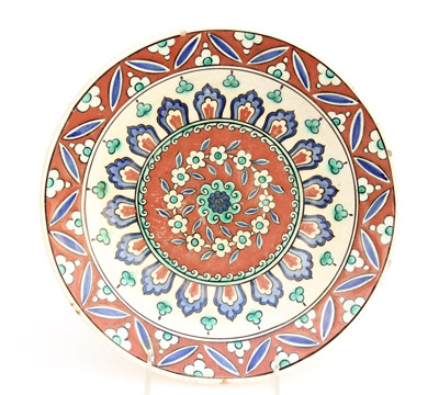 | Edme Samson (1810-1891) et Emile Samson (1837-1913) furent à l'origine de cette manufacture initialement installée en 1845 à Saint-Maur, puis à Montreuil en banlieue parisienne, avant d'ouvrir des boutiques à Paris, et qui se spécialisa dans la copie d'ancien, et qui perdura jusqu'en 1980. L'exemplaire ci-dessous est un plat en faïence de la Manufacture Samson, qui reprend la forme et les motifs des assiettes produites à Iznik au 16e siècle. Diamètre: 26,5 cm.Paris, fin 19e siècle. Le monogramme figurant au dos de cette assiette a été "effacé", preuve d'une ancienne "tentative" de reintroduire cette copie comme étant une authentique céramique d'Iznik. |
