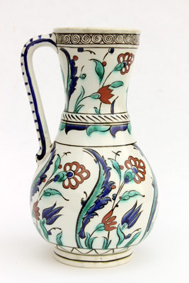 | Pichet en céramique à décor Iznik. Hauteur: 27 cm, signé BFK 14/28 à la base. Années 1880. La Louvière (Belgique). Le style "Rhodes" (nom donné à l'époque aux céramiques d'Iznik en Europe)est attesté chez Boch Frères Kéramis dès leur participation à l'exposition universelle d'Amsterdam en 1883. Le catalogue Boch de 1887 contient un très grand nombre de pièces à décor Iznik, où se cotoient tulipes, jacinthes, oeillets, feuilles de Saz disposées en rinceaux. |