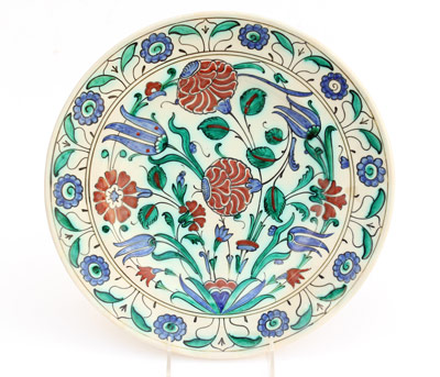 | Repris en main par Ulisse Cantagalli en 1878, l'atelier Cantagalli se spécialisa dans la copie des majoliques italiennes de la Renaissance, des céramiques hispano-mauresques à reflets métalliques et des céramiques d'Iznik. Le plat ci-dessous, d'un diamètre de 31,5 cm, datant de la fin du 19e, reprend les motifs de la céramique d'Iznik du tout début du 17e siècle. |