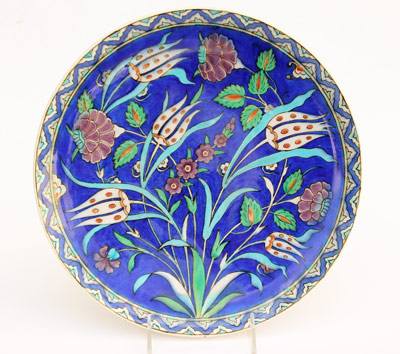 | Plat en faïence de Théodore Deck (1823-1891)à décor Iznik. Années 1860. Diamètre: 30 cm. Signé TH DECK en creux au dos. Ce plat est un parfait exemple du "bleu Deck", qui fut à l'origine de la renommée de Théodore Deck dès 1863. Pour les critiques de l'époque, il s'agissait d'un "bleu profond, limpide, pur, un bleu qui ne perd pas mais gagne en éclat à la lumière artificielle". Passionné par l'Orient islamique et notamment les céramiques d'Iznik, Deck élabora une pâte à forte teneur en silice, recouverte d'un émail alcalin blanc, qu'il appela engobe persan. Les couleurs appliquées sur ce fond seront recouvertes d'une glaçure extrêmement transparente. Présentées au public en 1861, elles reçoivent un acceuil triomphal. Paul Dalloz, dans le "Moniteur Universel", parle de "reflets électriques, d'aurores boréales et de lueurs féeriques". (extrait de Connaissance des Arts, septembre 1979) |