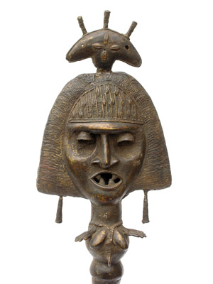 Figuration en bronze d'un reliquaire. Hauteur: 90 cm. Visage réaliste surmontant un corps féminin. Peuple Kota, Gabon, ou peuple Bamoun, Cameroun.