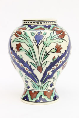 | Vase en céramique à décor Iznik. Hauteur: 18 cm. Signé BFK/19.D.61 au dos. Années 1880. La Louvière (Belgique). Le style "Rhodes" (nom donné à l'époque aux céramiques d'Iznik en Europe)est attesté chez Boch Frères Kéramis dès leur participation à l'exposition universelle d'Amsterdam en 1883. Le catalogue Boch de 1887 contient un très grand nombre de pièces à décor Iznik, où se cotoient tulipes, jacinthes, oeillets, feuilles de Saz disposées en rinceaux. |