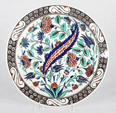 | Plat en céramique à décor Iznik. Diamètre: 30,5 cm. Années 1880. Signé BFK 52 LD au dos. La Louvière (Belgique). Le style "Rhodes" (nom donné à l'époque aux céramiques d'Iznik en Europe)est attesté chez Boch Frères Kéramis dès leur participation à l'exposition universelle d'Amsterdam en 1883. Le catalogue Boch de 1887 contient un très grand nombre de pièces à décor Iznik, où se cotoient tulipes, jacinthes, oeillets, feuilles de Saz disposées en rinceaux. |