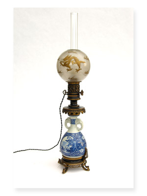 Paire de lampes à pétrole en porcelaine du Japon (Hirado). Montures en fonte de Barbedienne. Signées. 19e siècle. Hauteur avec la lampe: 72 cm.