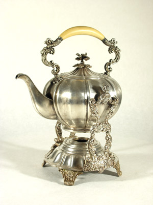Bouilloire à thé, son support et sa lampe (manque le brûleur), en métal doublé d'argent partiellement feuillagé, l'anse en ivoire. BALAINE. XIXème siècle.
