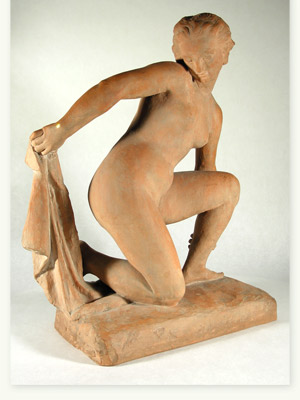 Baigneuse accroupie. Terre cuite de Philippe BESNARD (1885-1971).Circa années 1920. Edition de Barbedienne. Signée Besnard et Barbedienne sur la terrasse. Hauteur: 66 cm.