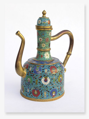 Verseuse en bronze doré et émaux cloisonnés, à fond bleu décoré en polychromie de fleurs de lotus et rinceaux. Chine, 19e siècle. Hauteur : 31 cm.