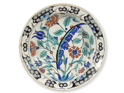 Datant des dernières années du 16e à cause de la pureté du l'engobe, ou du tout début 17e, cette assiette comporte plusieurs motifs des décors traditionnels des céramiques d'Iznik, oeillets, tulipes et feuilles de Saz. 26,5 cm de diamètre.