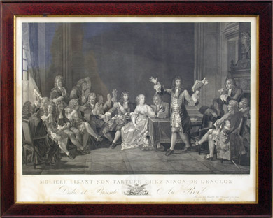 Gravure du 18e, dans son cadre et son verre d'origine. "Molière lisant son Tartuffe chez Ninon de l'Enclos - Dédié et présenté au Roy". 68x86 cm.