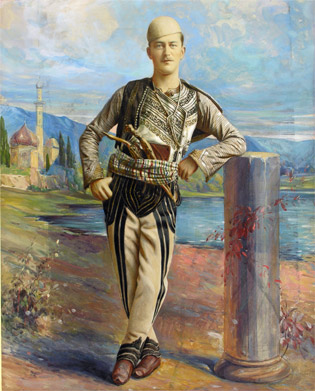 Personnage Albanais. Gouache sur fond photographique. Travail de la fin du 19e siècle. 50x40 cm.