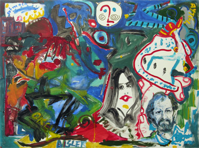| Toile collective, réalisée à la fin de l'exposition "Paristanbul", consacrée aux artistes turcs vivant en France, et organisée à la Cité Internationale des Arts en 1990. Oeuvre réalisée collectivement par Abidine Dino, Selim Turan, Hilda Yosmayan, Hasan Saygin, Esin Okcu, Selcuk Demirel, Ali Atmaca, Aysegul Beton, Mustafa Altintas, Omer Kalesi, Utku Varlik, Asim Isler, etc... Huile sur toile, 97x130 cm. |