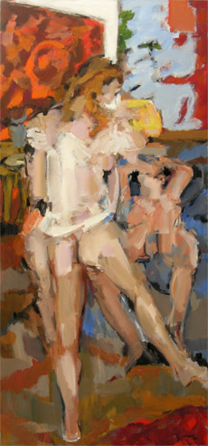 Robert Lapoujade (1921-1993). Huile sur toile, signée en bas à droite, intitulée "le couple au divan bleu" au dos, datée 1968. 90x200 cm.
