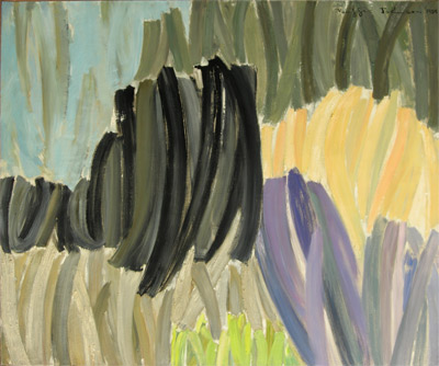 | Née en 1912 à New York. Elle étudia à New York, à Los Angeles, puis à l'Art Student's League à New York. Elle fit de longs séjours à Paris, et participa notamment au Salon des Réalités Nouvelles en 1949, 1950 et 1957. Michel Seuphor dit de sa peinture: "Sur un lit de couleurs, souvent monochrome, des bribes de calligraphie nagent, surnagent et se fondent." Huile sur toile, signée en haut à droite, datée 1959, 153x183 cm.