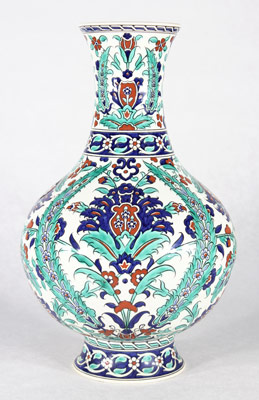 Grand vase à décor Iznik de la manufacture B.F.K. (Belgique). Circa années 1880, signé à la base B.F.K. / 69. Hauteur: 45 cm.