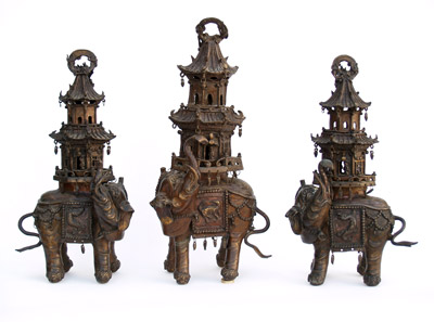 Brûle-parfums en bronze, en forme d'éléphants surmontés de pagodes. 19e siècle, Chine, dynastie T'sing. Hauteur du plus grand: 45 cm.
