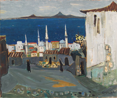 Jeanne LANGLOIS BELLOT (1894-1986). Huile sur panneau, signée en bas à gauche, 54x65 cm. "Village turc au sud de la Mer Egée", circa début des années 1960.
