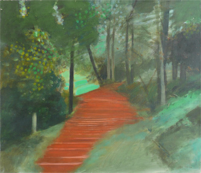 Ferit Iscan (1931-1986). L'escalier rouge à Kawana. Huile sur toile, signée en bas à droite, 45.5x53 cm, circa 1982.