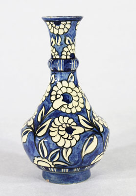 | Vase à décor stylisé Iznik, de 25cm de hauteur.. Signé Lachenal à la base. Formé chez son père Edmond, il exécuta ses propres pièces dès l’âge de 16 ans et exposa pour la première fois à 19 ans. Il monta son propre atelier de porcelaine de grand feu à Boulogne sur Seine en 1911. En 1914, il exposait au pavillon de Marsan avec plusieurs autres céramistes. |