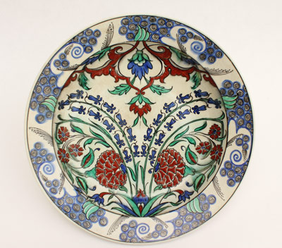 | Grand plat en faïence à décor Iznik de la Manufacture Samson. Diamètre: 44 cm. Paris, fin 19e siècle. Les motifs sont directement inspirés de la céramique d'Iznik du 16e siècle. Le plat est signé au dos avec l'un des monogrammes de la maison Samson, ressemblant à une lettre de l'alphabet arabe, et qui laissa penser à un grand nombre d'acquéreurs qu'ils venaient de mettre la main sur une authentique céramique d'époque. |