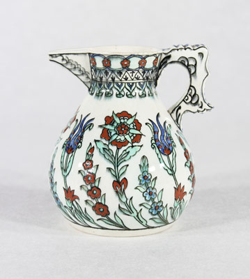 | Petit pichet à décor stylisé Iznik, de la Manufacture Samson. Siglé à la base.Hauteur: 12.5 cm. Edme Samson (1810-1891) et Emile Samson (1837-1913) furent à l'origine de cette manufacture initialement installée en 1845 à Saint-Maur, puis à Montreuil en banlieue parisienne, avant d'ouvrir des boutiques à Paris, et qui se spécialisa dans la copie d'ancien, et qui perdura jusqu'en 1980. |