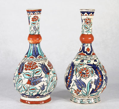 Paire de vases à décor Iznik, circa fin XIXe. Hauteur 30 cm. Signés d'un double "L" entourant un "C" à la base.